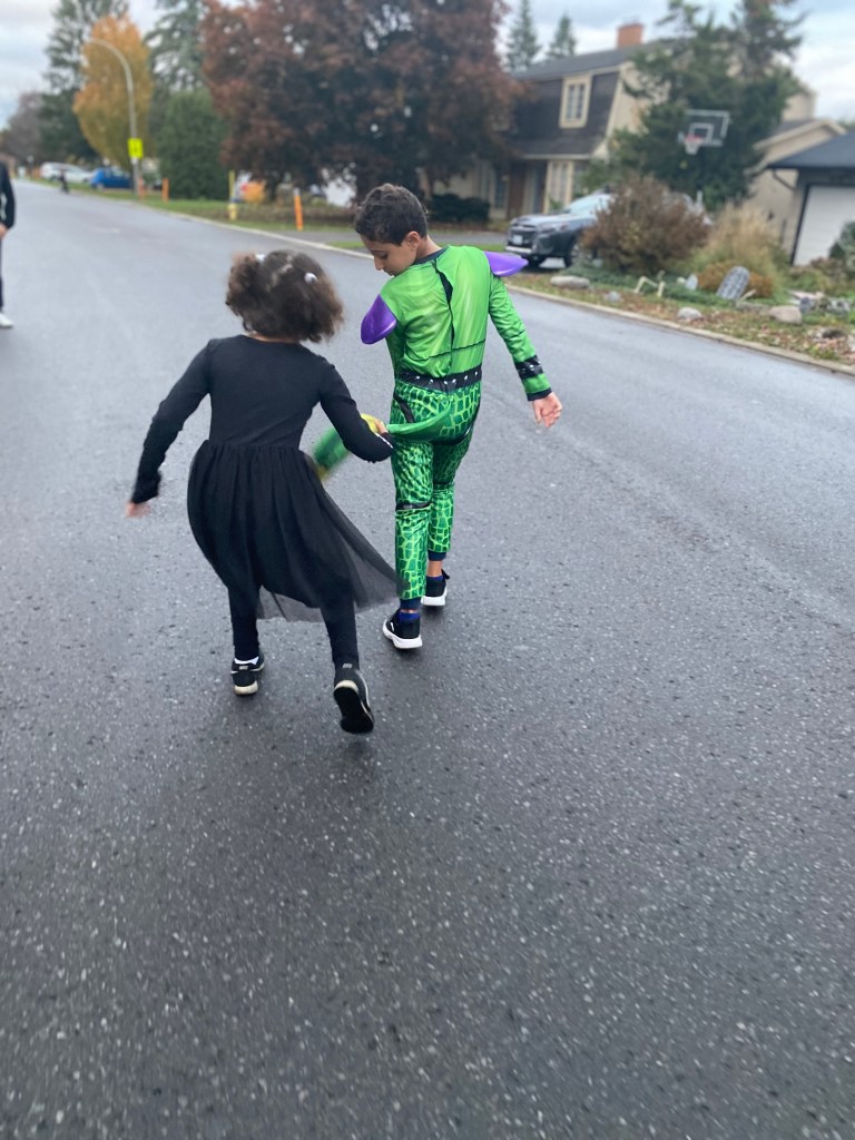 Ă l’heure oĂč j’Ă©cris ce billet, on est en janvier, et pour le moment tout se passe pour le mieux! Les voici fin Octobre, en route pour l’Ă©cole pour fĂȘter Halloween đ